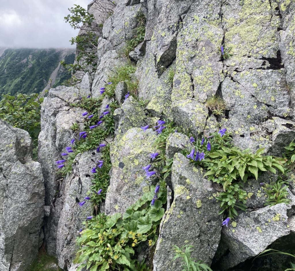ハイマツ帯を抜けるとイワギキョウが群生している場所がちらほら。大学の卒論でキキョウ科ホタルブクロ属を研究していたので、岩場に小さく生えている青い花や他の高山植物を見かける度に思わず止まって観察していました。イタリアで見た種より花が大きく長くて遠くからでも見つけやすいです。