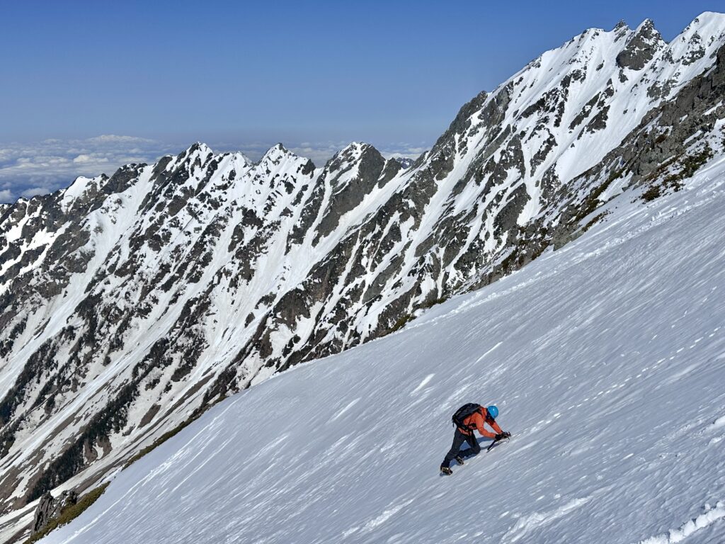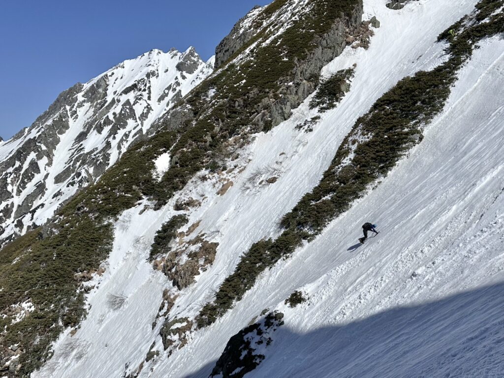 明神のコル方向との分岐点、ダイレクトルンゼの入り口あたり、上部ノドの部分と同じく、ルート上で一番最初に雪が薄くなり、ハイマツが露出してくるあたりはやはり雪つきは少なめでした