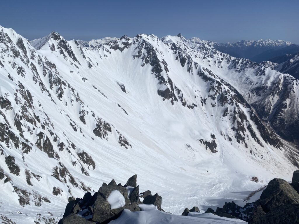 下りも慎重にクライムダウンを繰り返し、安全地帯まで下りれば一安心、ふたたび見上げる穂高の眺めに戻ってきました。