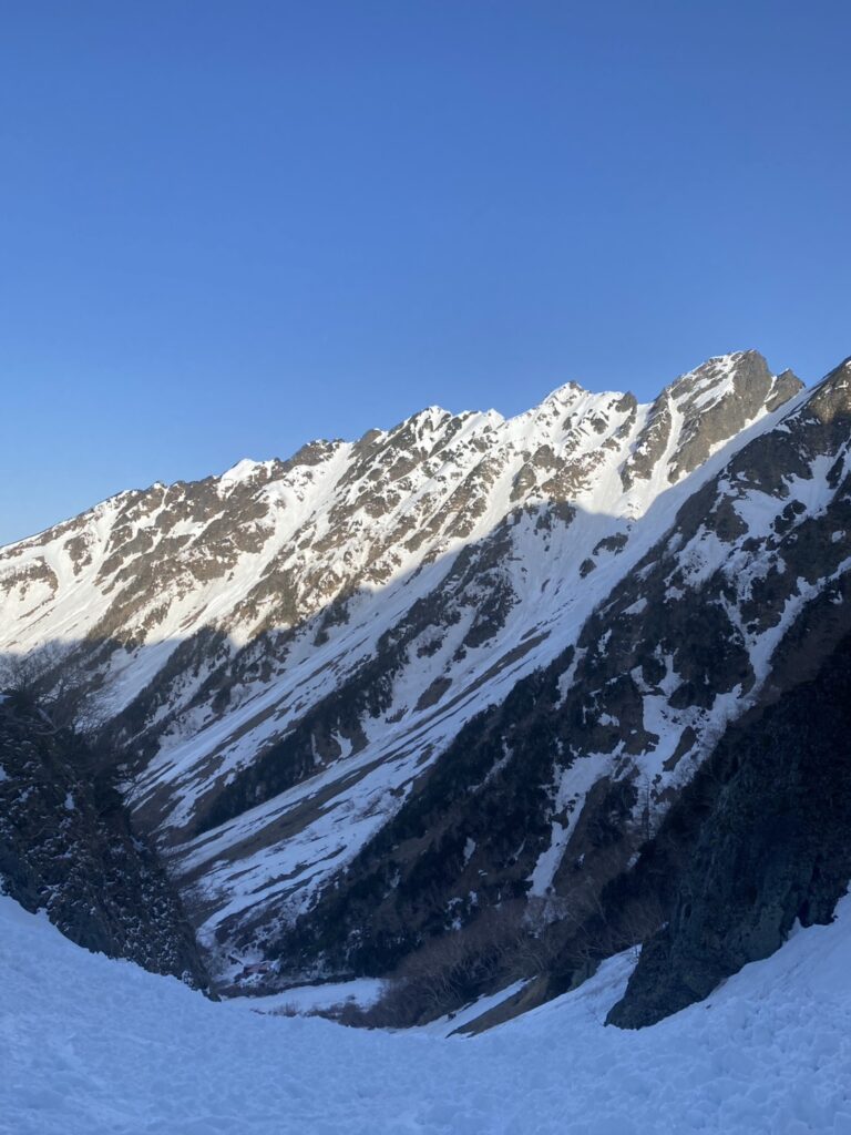 こんにちは岳沢小屋です。 営業開始を明日に控え、除雪作業もひと段落、気になっていました前穂高岳への直登ルート、ダイレクトルンゼを偵察してまいりました。