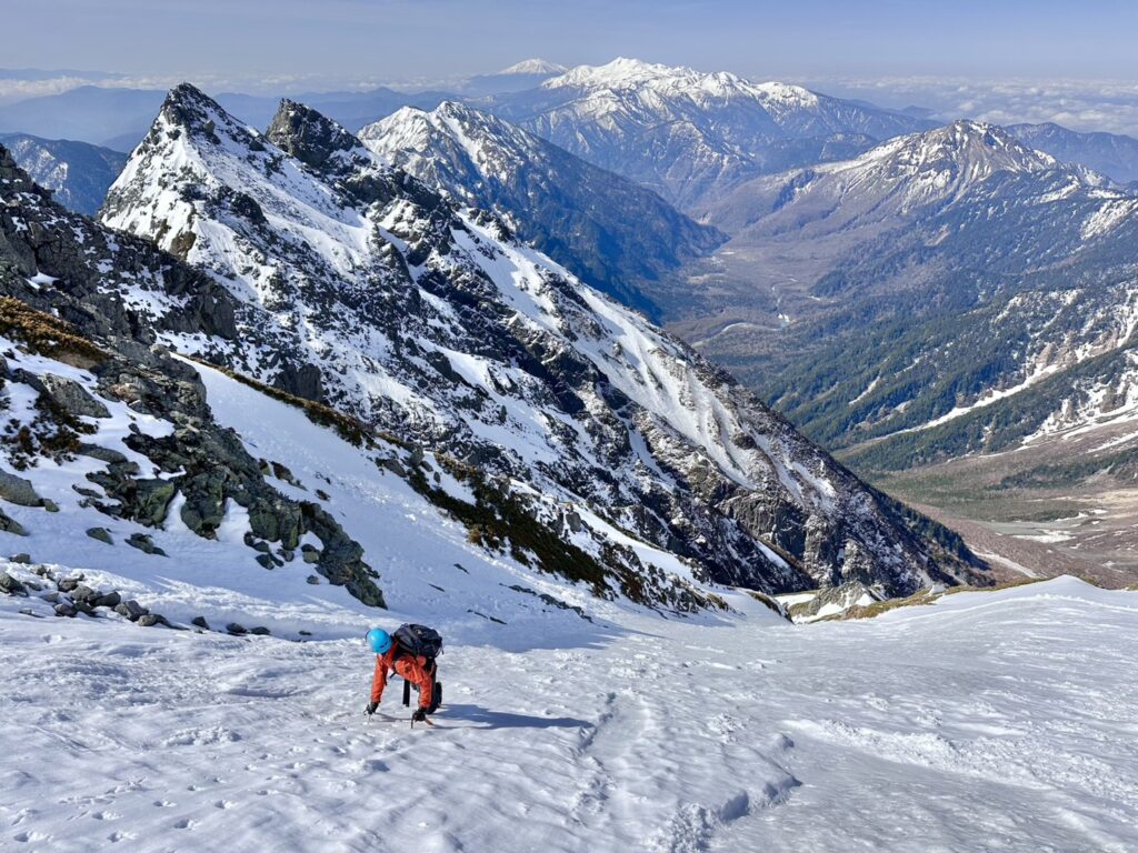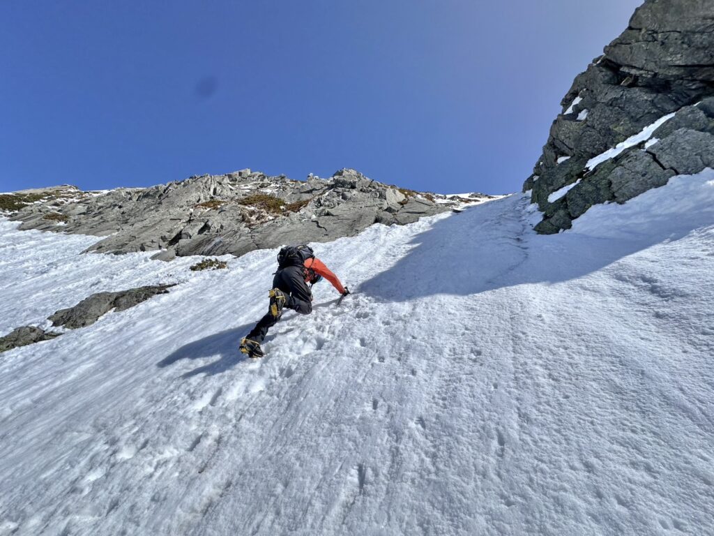 歩を進め、ノドの部分、こちらも雪は薄いですがまだまだ通れます。雪が融けて凍ってを繰り返し、岩に氷が張り付いた状態となっています、とにかく固く、アックスを一振りずつ効かせ、前爪を力いっぱい蹴り込み効かせながら慎重によじ登ります。長距離滑落、負傷を経験した人間はとても慎重になります。体が恐怖を覚えているものでして。。