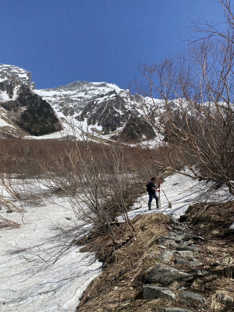 岳沢トレイル上の残雪状況ですが、今年は雪が少なく、登山口より3番付近までは夏道で登って来ることが出来ます。風穴付近に多少の残雪がありますが、問題なく乗り越えられます。