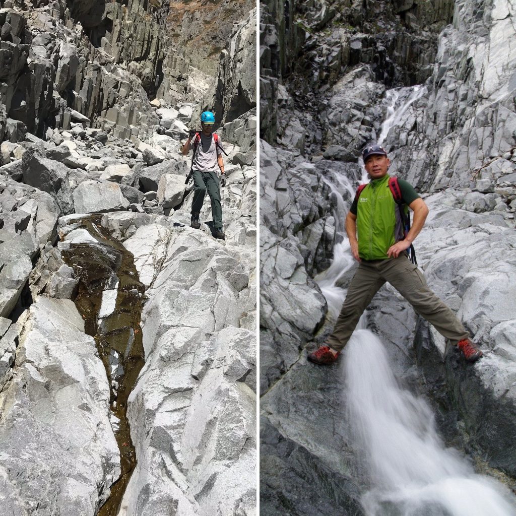 過去の氷河や激しい流水で磨かれた扇沢の末端はゴルジュと呼ばれ、穂高岳を形成する岩盤が露出した場所になっています。そこには広い扇沢の涵養域から集まった地下水が滔々と流れているのが常なのですが、今年の秋は異常少雨のためにこんなにチョロチョロと舐める程度の水しか流れてませんでした。この量では小屋までの数百mの間の導水パイプで引くだけの水は集めようがありません。