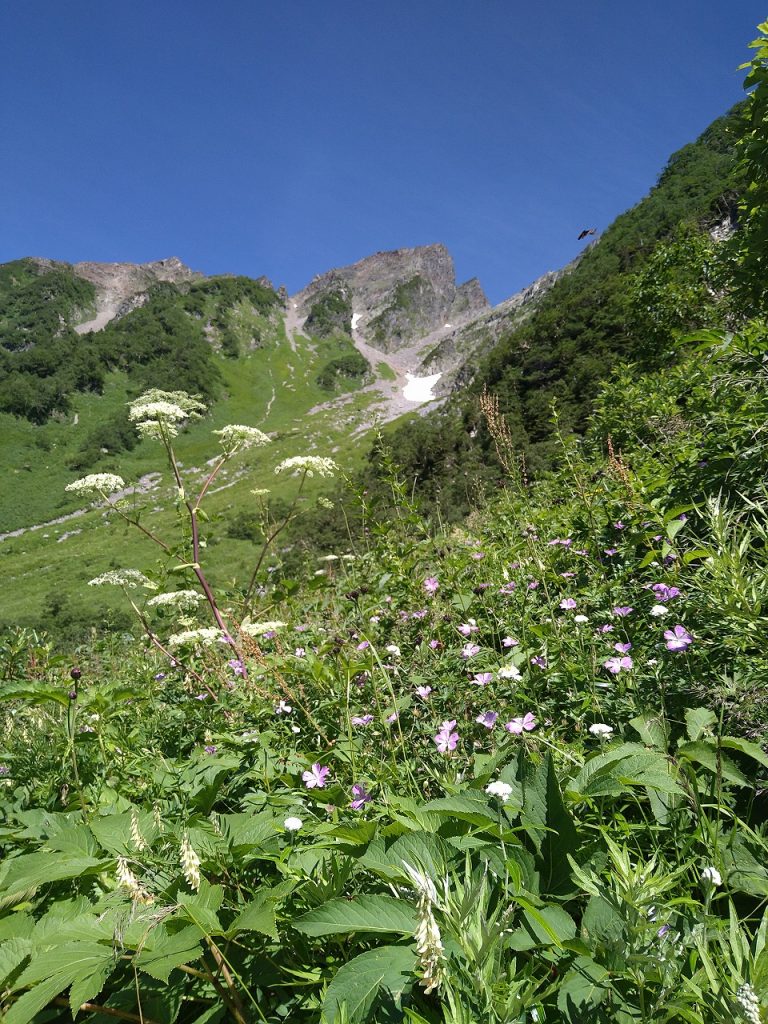 天狗沢は岳沢のすぐ隣にある広い沢夏にはお花畑が広がり、人...