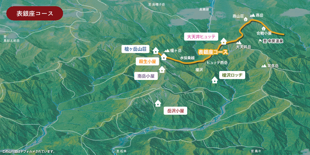 中房温泉方面から登るコース。大天井ヒュッテで1泊してからどうぞ。稜線漫歩で変わりゆく槍の勇姿をお楽しみください。