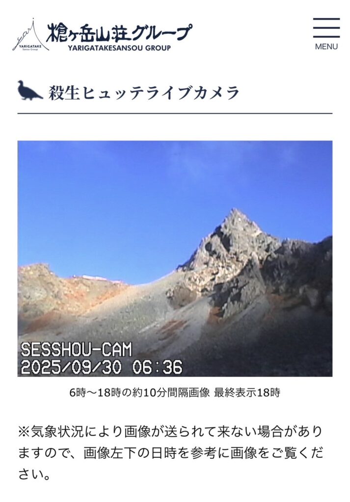 先日、殺生ヒュッテにもついにライブカメラが設置されました!槍ヶ岳山荘グループのHPからいつでも見ることができます。