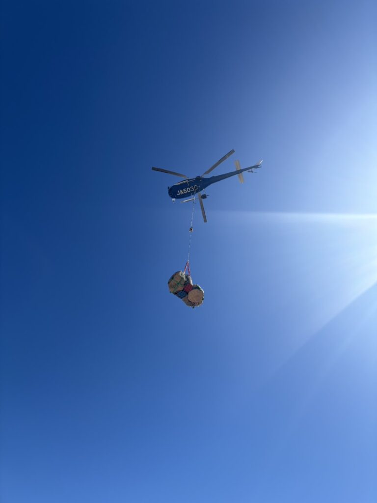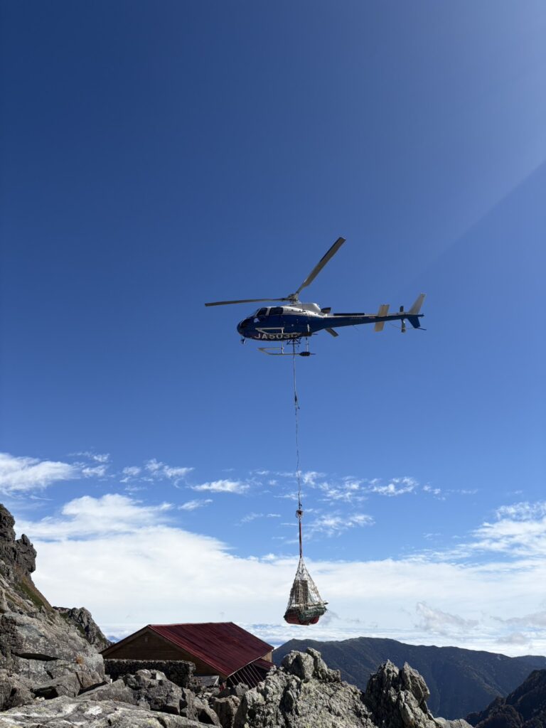 非常にいい天気でヘリ日和。最終便を無事運んで来てくれました!山小屋にはなくてはならないヘリ。