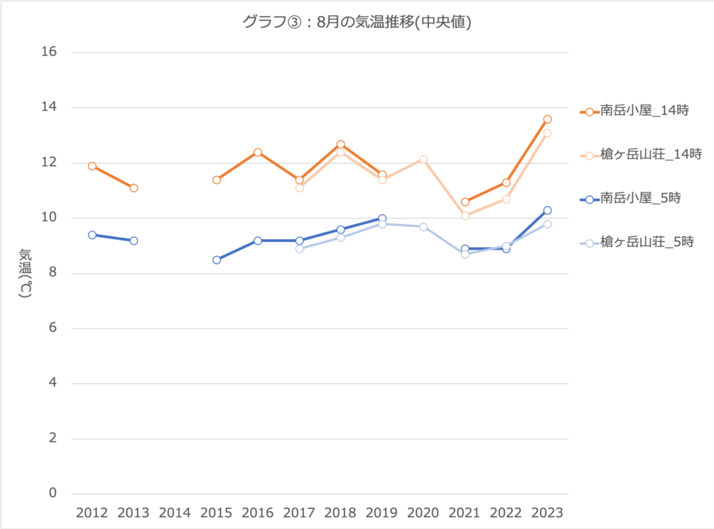 今年が最も暑かったことは見て取れますが、上昇トレンドにあるとは言えなさそうです。正直、顕著に右肩上がりの結果が出ることを予想していたので、少し期待外れですね。ちなみに、標高が100m上がると気温は0.6~1℃下がるようですが、南岳小屋は槍ヶ岳山荘より約100m標高が低いところにありますので、南岳小屋の方が高い数値が出ているのは妥当かと思われます。
