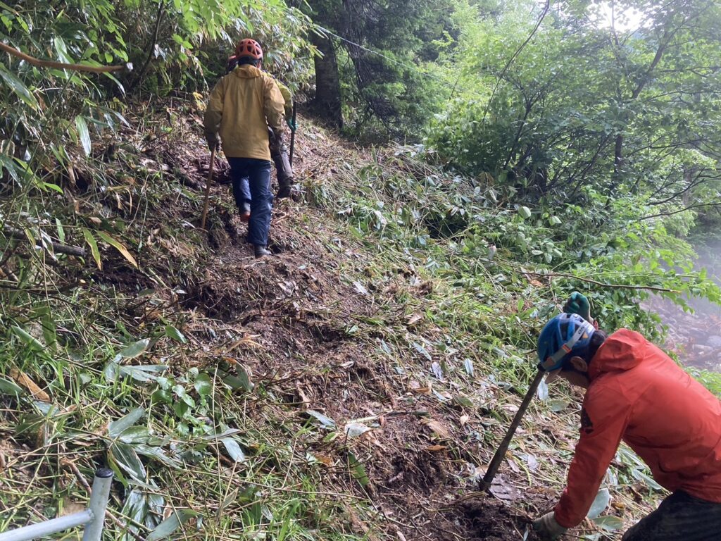 こちらは、本来右の矢印のように真っ直ぐ登山道が伸びておりましたが、増水した川によって抉り取られてしまった為、左の矢印の方に巻道を造成してあります。