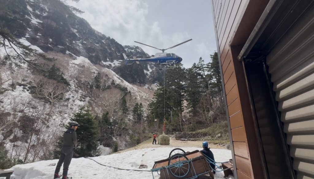 山小屋生活は初めてでまだまだ慣れないことばかりですが、毎日の新しい発見があってとても充実しています。(ヘリの風圧に負けぬよう小屋にしがみついて撮りました!)