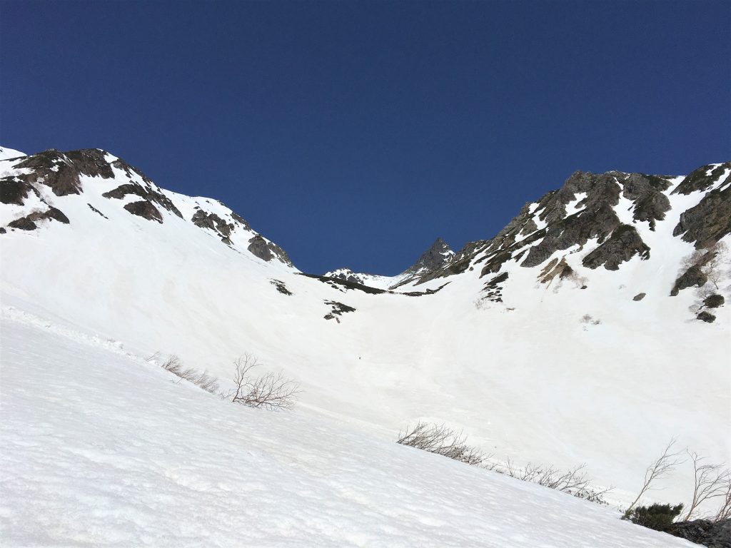 大曲りから丸山の下ですが、例年通りに雪崩の跡があります。ここはデブリの右側に沿って旗竿を立てましたので、右のルートを進んでください。